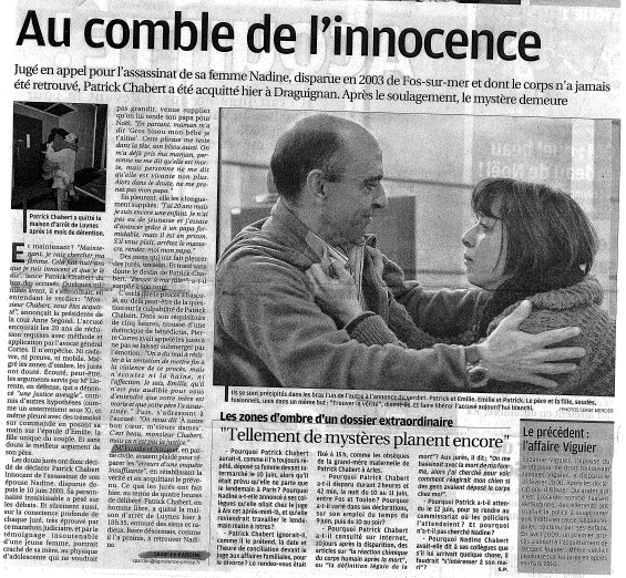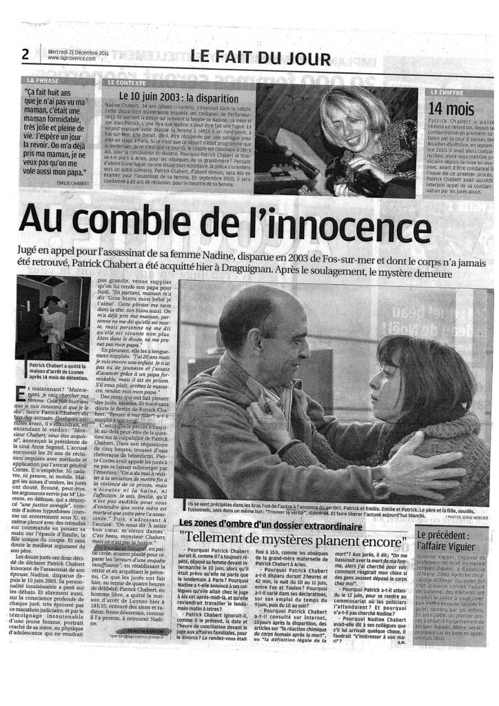 Jugé en appel pour l’assassinat de sa femme Nadine, disparue en 2003 de Fos-sur-mer et dont le corps n’a jamais été retrouvé, Patrick Chabert a été acquitté hier à Draguignan. Après le soulagement, le mystère demeure…