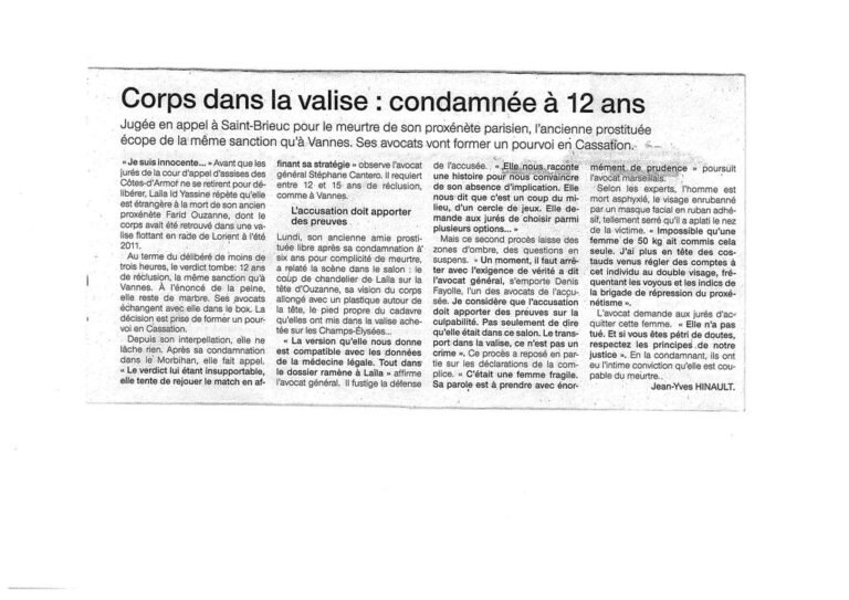 Jugée en appel à Saint-Brieuc pour le meurtre de son proxénète parisien, l’ancienne prostituée écope de la même sanction qu’à Vannes. Ses avocats vont former un pourvoi en Cassation…