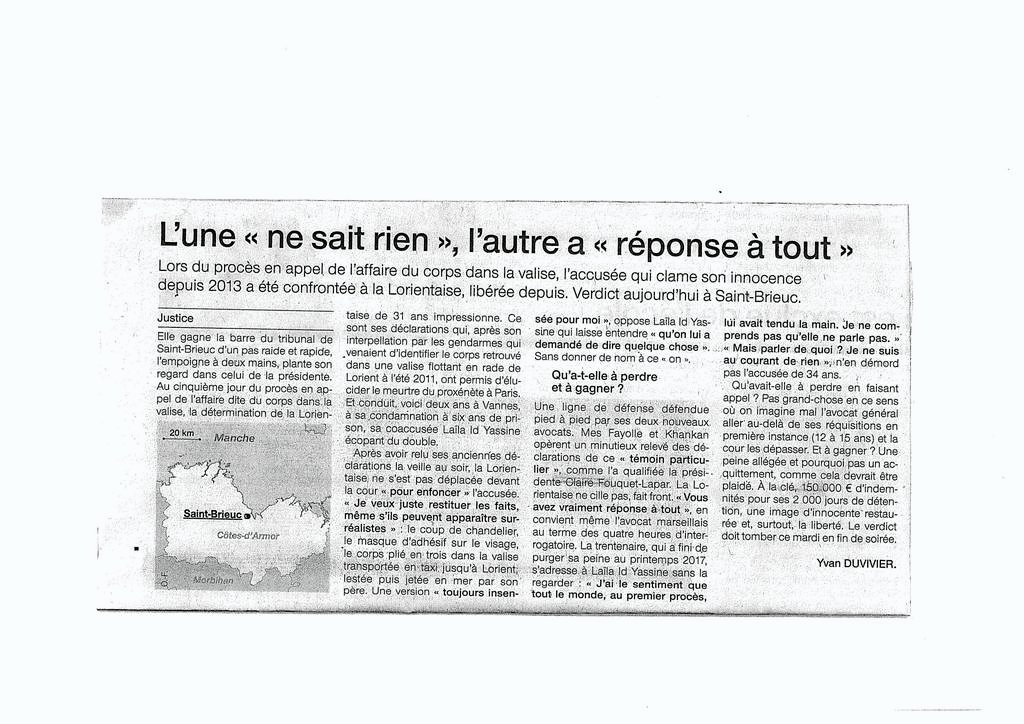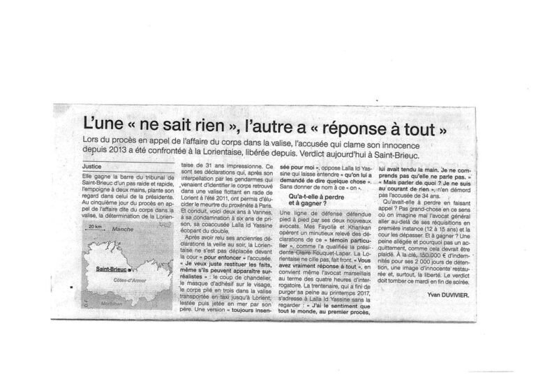 Lors du procès en appel de l’affaire du corps dans la valise, l’accusée qui clame son innocence depuis 2013 a été confrontée a la Lorientaise, libérée depuis. Verdict aujourd’hui à Saint-Brieuc…