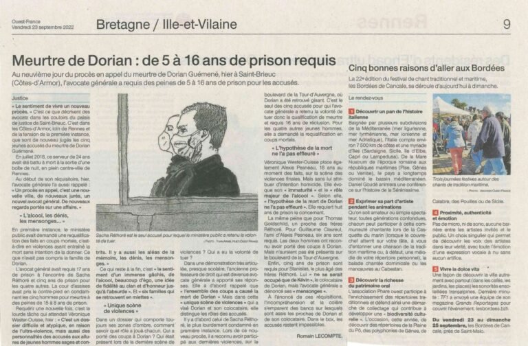 Au neuvième jour du procès en appel du meurtre de Dorian Guémené, hier à Saint-Brieuc (Côtes-d’Armor), l’avocate générale a requis des peines de 5 à 16 ans de prison pour les accusés…