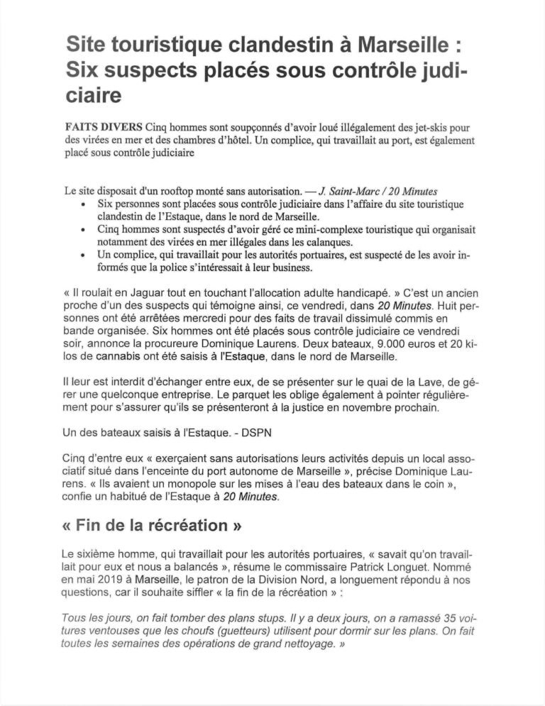 FAITS DIVERS Cinq hommes sont soupçonnés d’avoir loué illégalement des jet-skis pour des virées en mer et des chambres d’hôtel. Un complice, qui travaillait au port, est également placé sous contrôle judiciaire
